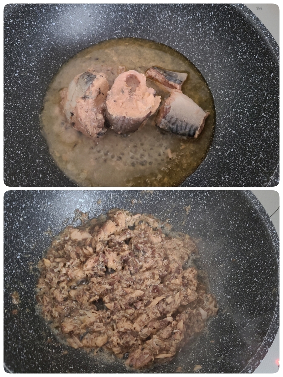 ①フライパンにゴマ油とサバ缶+ショウガ+料理酒を加え
